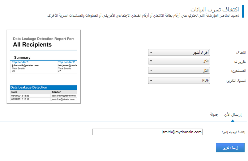 استخدم هذا التقرير لاكتشاف رسائل البريد الإلكتروني التي يحتمل أن تحتوي على بيانات حساسة. سيكتشف التقرير رسائل البريد الإلكتروني المرسلة أو المتلقاة التي تتضمن: