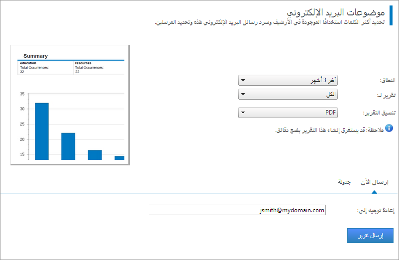 يعرض التقرير الذي يتم إنشاؤه صندوق البريد المحدد (الخاص بمستخدم أو مجموعة) في أعلى التقرير. يعرض ملخص التقرير أهم 5 كلمات أساسية للمستخدم المحدد وإجمالي عدد رسائل البريد الإلكتروني لكل كلمة أساسية. يعرض مخطط عمودي مكدس أهم 10 كلمات أساسية على المحور س وعدد مرات العثور على هذه الكلمات على المحور ص.