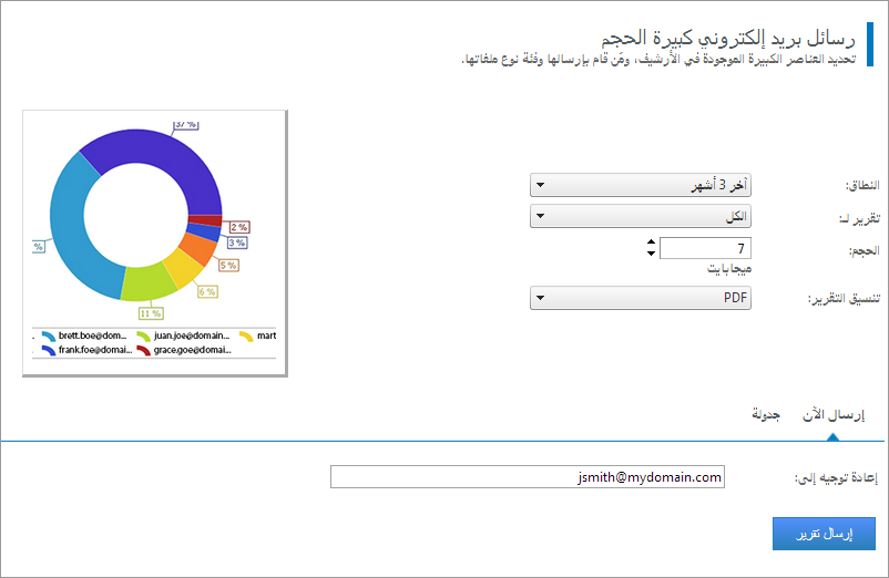 يعرض التقرير الذي يتم إنشاؤه صندوق البريد للمستخدم أو المجموعة المحددة في أعلى التقرير. يعرض ملخص التقرير أهم 5 مستخدمين المحدد وإجمالي حجم عدد رسائل البريد الإلكتروني المرسلة للفترة المحددة. يعرض المخططان تمثيلاً جغرافيًا لحجم رسائل البريد الإلكتروني التي يتم إرسالها بنسب مئوية، واحدة لأهم المستخدمين والأخرى لفئات المرفق. على سبيل المثال، إذا أرسل المستخدم "أ" 5 رسائل بريد إلكتروني بحجم 5 ميجابايت لكل بريد (إجمالي 25 ميجابايت) وأرسل المستخدم "ب" 4 رسائل بريد إلكتروني بحجم 10 ميجابايت لكل بريد (إجمالي 40 ميجابايت)، فإن المستخدم "ب" سيكون لديه أكثر من %age في المخطط.