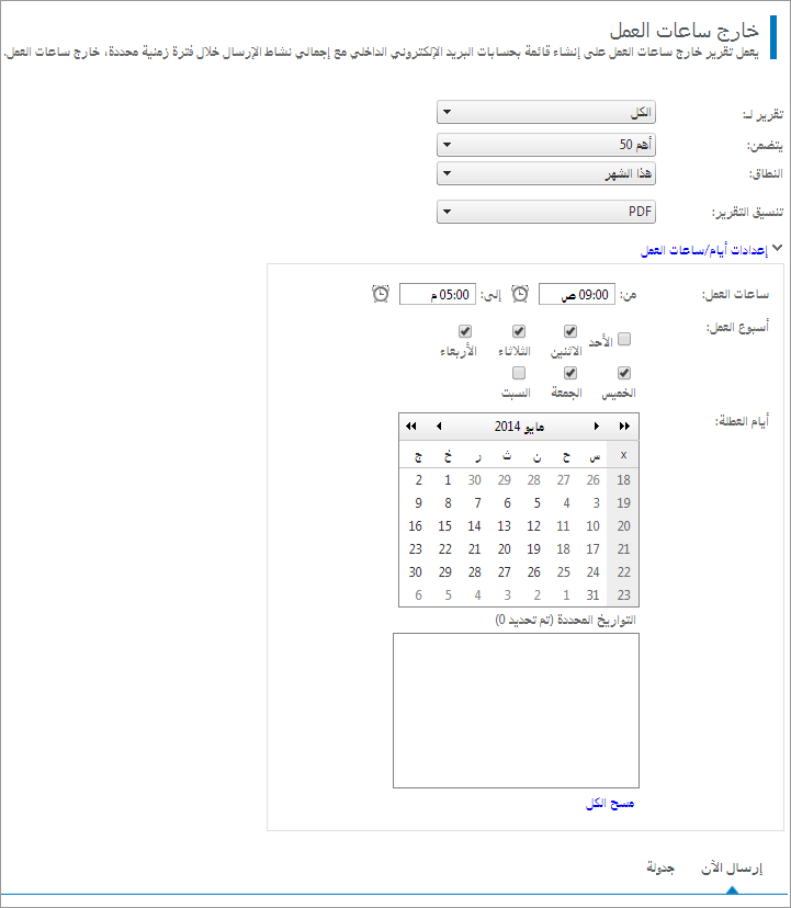 استخدم هذا التقرير لتحديد المستخدمين الداخليين الذين يقومون بإرسال رسائل بريد إلكتروني خارج ساعات العمل.