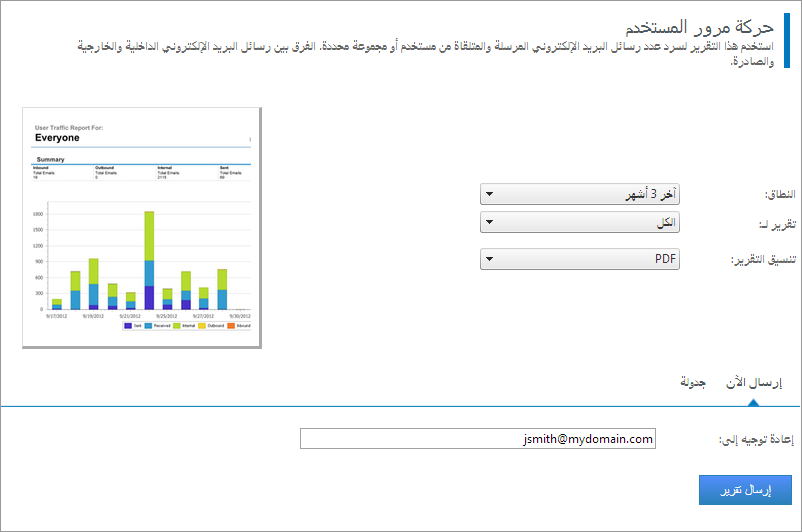 يقدم رسم حركة مرور المستخدم نظرة عامة على عدد رسائل البريد الإلكتروني المتبادلة بين مستخدمين أو مجموعات محددة وجهات الاتصال الخاصة بهم. كما يسرد عناوين البريد الإلكتروني لرسائل البريد الإلكتروني المرسلة أو المستلمة.