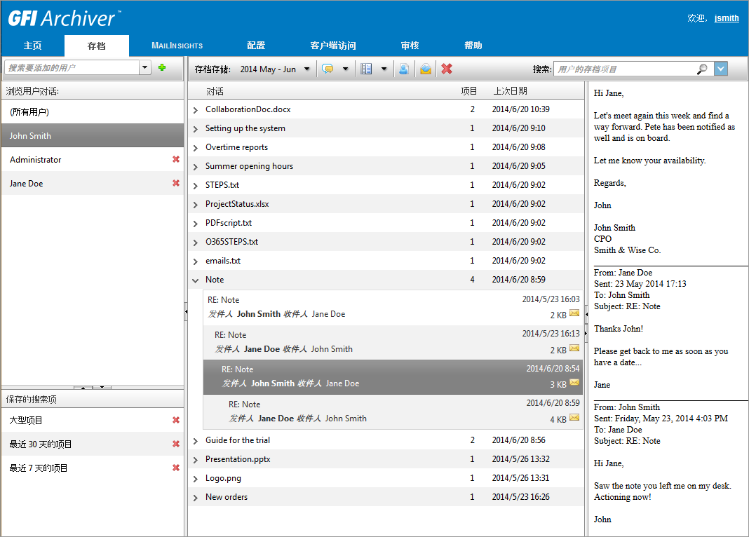 在存档选项卡中,您还可浏览其他用户的邮箱中已存档的项目 - 如果您已被授权访问其存档。 具有管理员权限的用户可通过 GFI Archiver 访问控制功能授权或撤消对其他用户邮箱的访问。