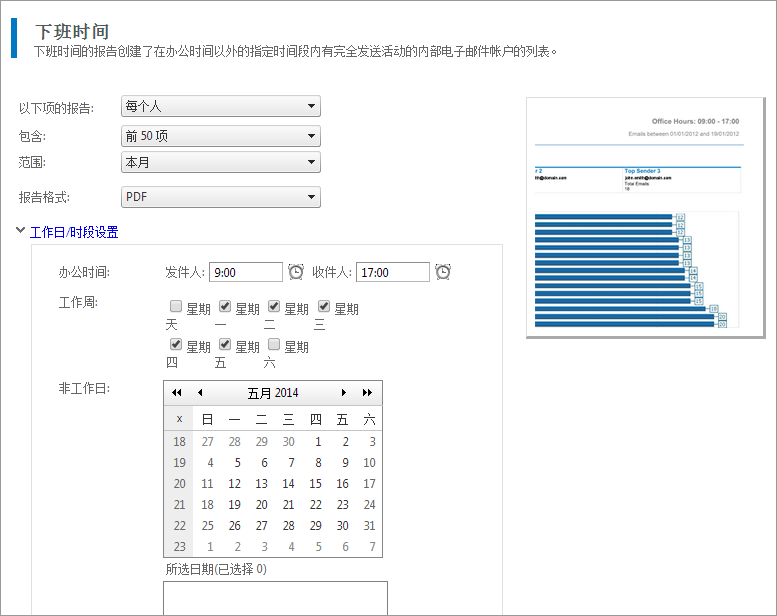 报告将包含从星期一到星期五下午 6.00 到上午 9.00 以及星期六和星期日全天发送的电子邮件。