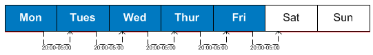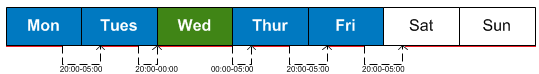 情景 2: 某个组织的工作时间从星期一到星期五, 上班时间和下班时间跨午夜,例如从晚上 8.00 到早晨 5.00。