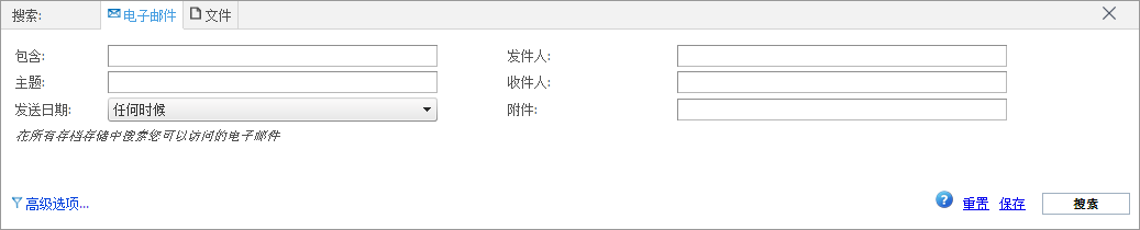 简单搜索是快速搜索功能的扩展,使您可以使用附加搜索条件搜索所有存档存储中的电子邮件、文件、日历项目或传真/SMS 邮件。
