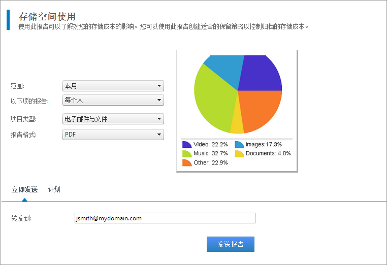 存储空间使用报告显示不同的附件类型使用多少空间。