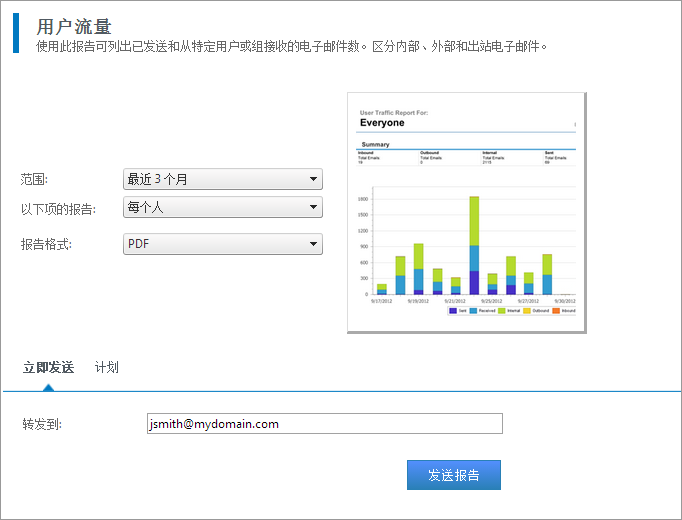 “用户流量”图提供所选用户或组与其联系人之间交换的电子邮件数量概览。 它还列出已发送或已接收电子邮件的唯一电子邮件地址。