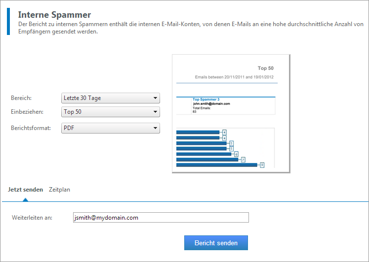 Der Bericht zu internen Spammern ermöglicht Ihnen die Erstellung einer Liste, welche die internen E-Mail-Konten der Benutzer enthält, die eine große Anzahl von Empfängern in ihre E-Mails aufnehmen. Dieser Bericht enthält die Empfänger der Felder „An“, „CC“ und „BCC“.