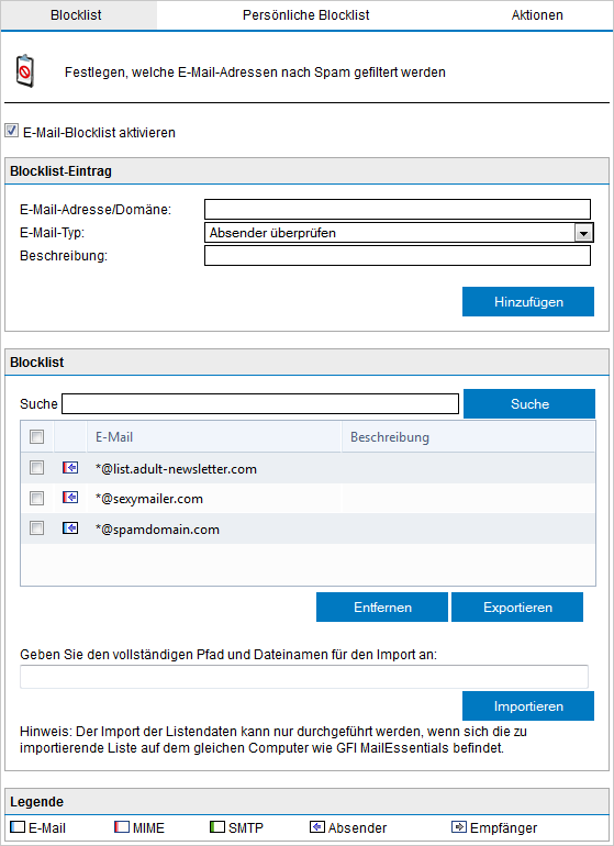 Importieren Sie eine Liste von Blocklist-Einträgen aus einer XML-Datei. HINWEIS Eine Liste mit Einträgen kann aus einer XML-Datei importiert werden, die dieselbe Struktur wie Exporte von Listeneinträgen aus GFI MailEssentials aufweist. |