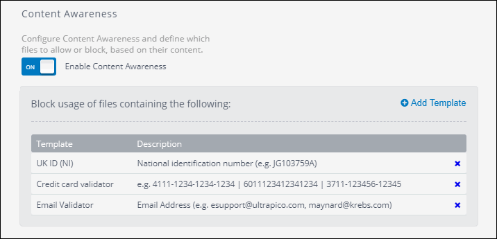 - Turn on or off Enable Content Awareness. Content Awareness enables you to specify the file content restrictions for a particular protection policy. The content awareness feature looks into files transiting the endpoints via removable devices and it identifies content based on pre-configured and custom regular expressions and dictionary files.