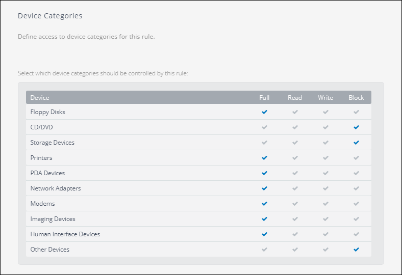 - Under DevicesMachines connected to a network that have been discovered by GFI OneGuard. Categories, configure the access to device categories for this rule. The available permissions are: