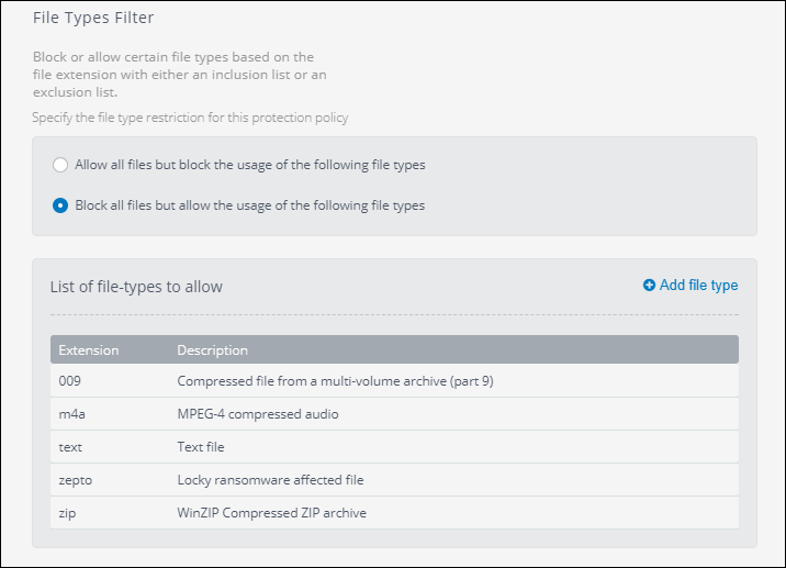 | Allow all files but block the usage of the following file types | Select this option to allow all file types except the files present in the File type list. |