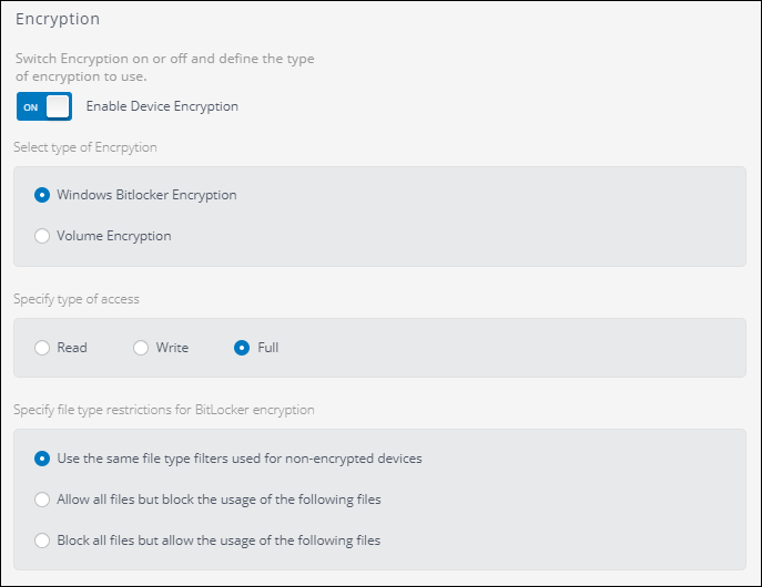 | Use the same file type used for non-encrypted devices | When this option is select the settings for the file type filtering used in the policy is applied. |