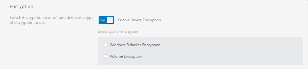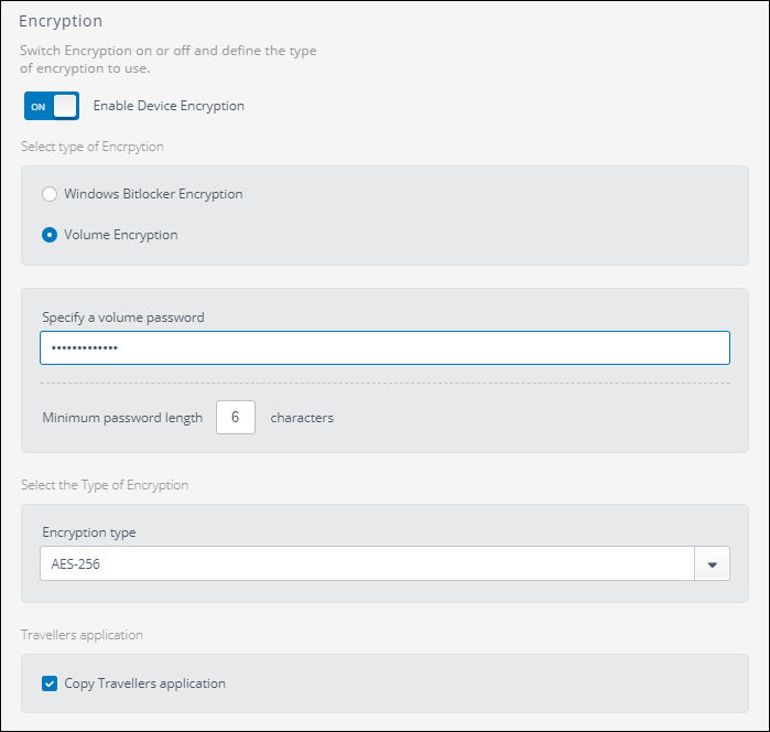 Volume Encryption enables you to encrypt the contents of USB devices using AES 256 encryption. When volume encryption is enforced, users must provide a password to encrypt or access storage devices data.