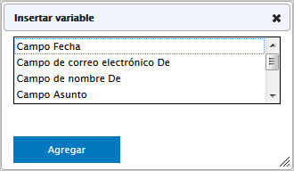 - Haga clic en Variable… para personalizar las respuestas automáticas empleando variables. Seleccione el campo variable que quiera insertar y haga clic en Agregar. Estas son las variables disponibles: