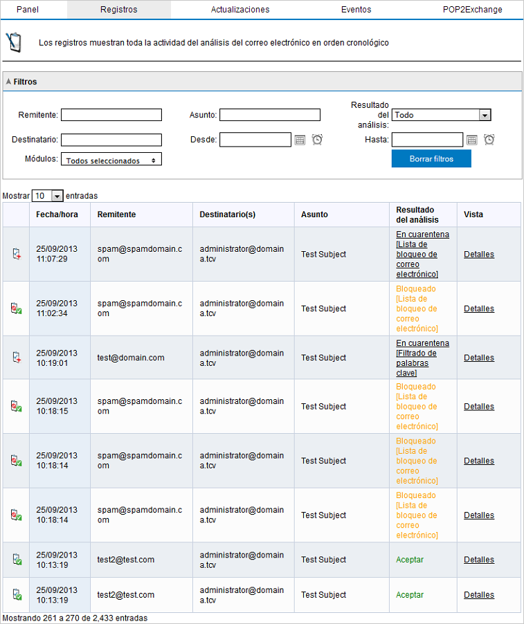 Módulos Muestre solo los mensajes de correo electrónico que han bloqueado filtros o motores concretos.
