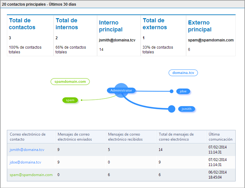 La zona superior del informe muestra las estadísticas totales del flujo de comunicación de los 30 días anteriores.