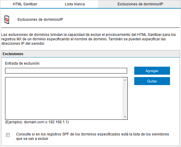 Si la dirección IP de la que ha partido el correo electrónico (la que se ha enviado al servidor perimetral) es una IP que aparece en la pestaña Exclusiones de dominios/IP o que se resuelve desde un dominio de la misma lista, HTML Sanitizer no procesa el correo electrónico. La lista de exclusión también acepta dominios, resuelve los registros de MX de los dominios y (opcionalmente) comprueba el registro de SPF para obtener direcciones IP.