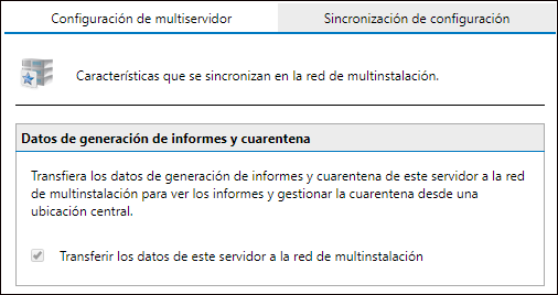 - Desde el área de datos de cuarentena y generación de informes, habilite la opción Transferir los datos de este servidor a la red de multinstalación.