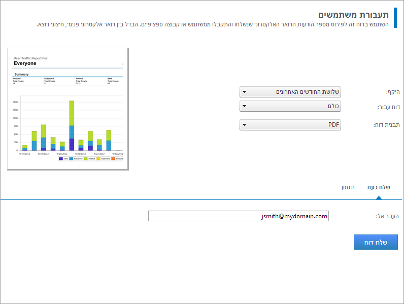גרף תעבורת המשתמשים מספק סקירה כללית של מספר הודעות הדואר האלקטרוני שהוחלפו בין משתמשים או קבוצות נבחרים ואנשי הקשר שלהם. הוא גם מפרט כתובות דוא"ל ייחודיות של הודעות שנשלחו או התקבלו.
