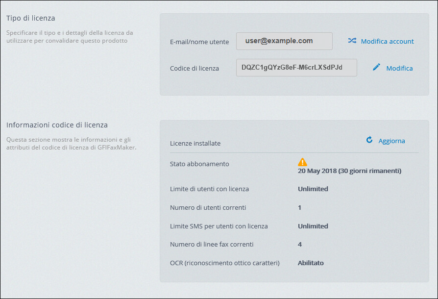- Fare clic su Modifica account per utilizzare un altro account GFI oppure su Modifica per modificare il codice di licenza. Per ulteriori informazioni, fare riferimento a Come ottenere l'abbonamento GFI FaxMaker.