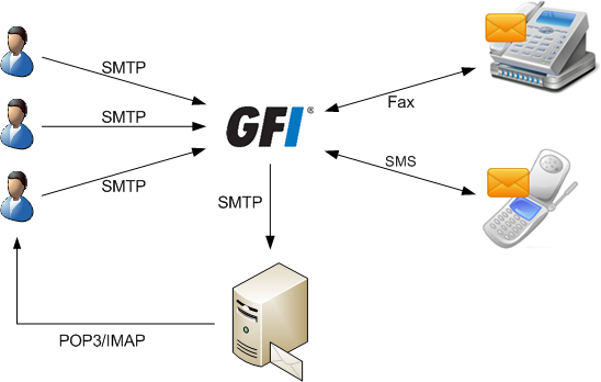 I clienti di GFI FaxMaker inoltrano fax/SMS direttamente a GFI FaxMaker via SMTPSimple Mail Transport Protocol. NOTA: Installare il servizio SMTP di IISInternet Information Services nel server GFI FaxMaker. |