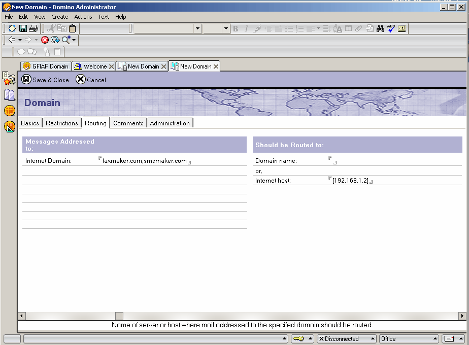 5. Selezionare la scheda RoutingI metodi utilizzati da GFI FaxMaker per determinare la modalità di inoltro dei fax ai destinatari interni. e in Messaggi indirizzata a, impostareDominio Internet su: faxmaker.com,smsmaker.com