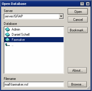 1. In Domino Administrator, selezionare File > Database > Open per aprire il database di GFI FaxMaker.