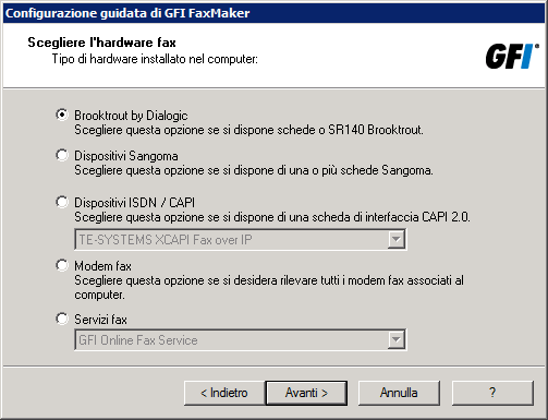 - Proseguire all’interno della procedura guidata fino alla schermata Scegliere l'hardware fax. Fare clic su Brooktrout by Dialogic e fare clic su Avanti per avviare il processo di configurazione dei driver.