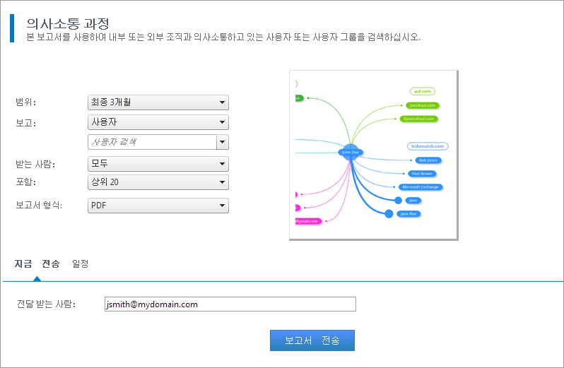 의사소통 과정 그래프는 선택된 사용자/그룹과 연락처 사이에 교환된 전자 메일에 대한 개요를 제공합니다.
