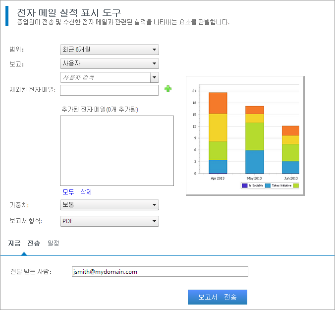 | 제외된 전자 메일 | 보고서에서 제외할 전자 메일 주소를 입력합니다. 예를 들어, 뉴스레터와 자동 시스템 알림을 제외할 수 있습니다. 예: *@newsletters.com. |