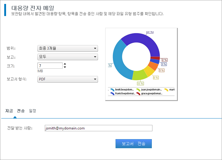 대용량 전자 메일 보고에서는 선택한 사용자 또는 그룹과 해당 연락처 사이에 주고받은 전자 메일 중 지정된 크기보다 큰 전자 메일을 식별합니다. 또한 첨부 파일 범주(예: 동영상, 이미지, 음악, 문서 등)를 나열합니다.