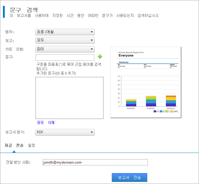 문구 검색 보고서를 사용하여 보관한 전자 메일 내에서 특정한 용어 또는 문구를 검색합니다. 보고서에서 지정된 용어가 포함된 전자 메일을 검색하기 위해 전체 전자 메일 본문과 첨부 파일에서 검색 쿼리를 실행하고 결과를 원형 차트 또는 누적 선 그래프로 표시합니다.