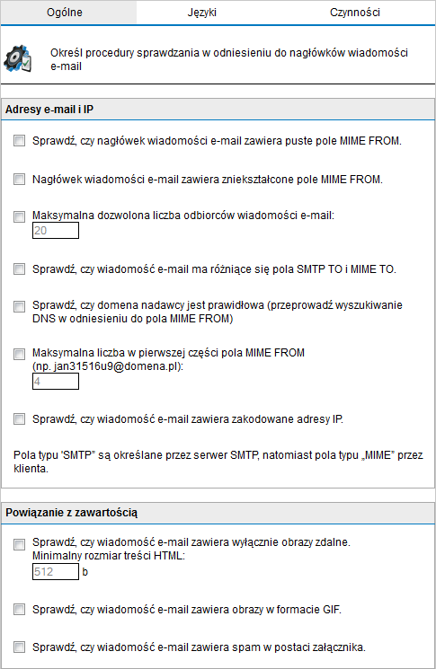 - Przejdź do obszaru Funkcja antyspamowa > Filtry antyspamowe > Sprawdzanie nagłówków.