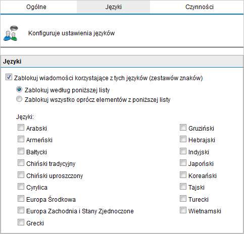 - Aby włączyć funkcję wykrywania języka, na karcie Język wybierz opcję Zablokuj wiadomości korzystające z tych języków (zestawów znaków).