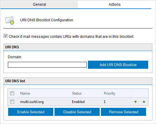 Selecione uma Lista de bloqueio DNS URI e clique em Enable Selected para habilitá-la. OBS. É recomendável desativar qualquer outra lista de bloqueio DNS URI quando habilitar multi.surbl.org, pois isso pode aumentar o tempo de processamento de e-mails. |