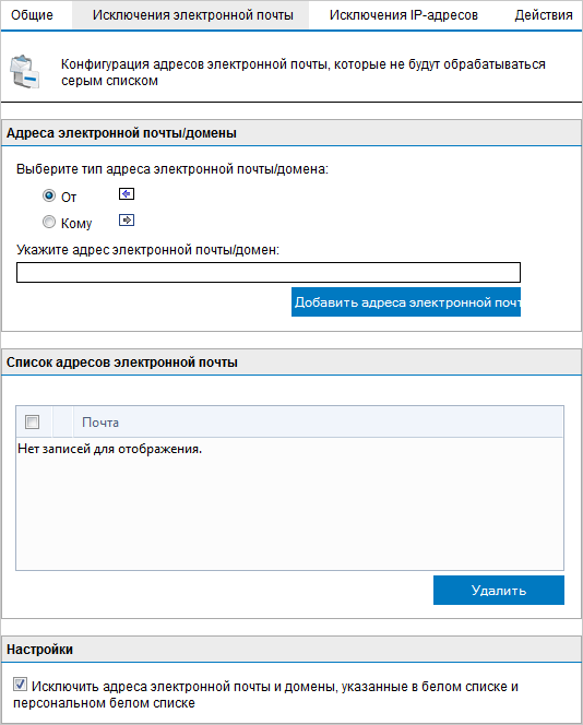 Чтобы избежать занесения в серый список и задерживания сообщений с почтовых адресов и доменов, которые находятся в белом списке и автоматически внесены в белый список, выберите параметр Исключить адреса электронной почты и домены, указанные в белом списке и персональном белом списке.