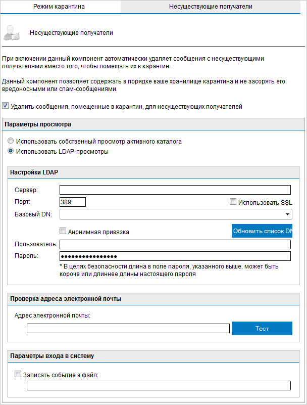 Для фильтра «Несуществующие получатели» необходим доступ к списку локальных адресов. Он осуществляется либо с помощью Active DirectoryТехнология, которая обеспечивает работу различных сетевых служб, включая службы каталогов, аналогичные LDAP., либо (если взаимодействие с Active Directory невозможно) с помощью LDAPПротокол LDAP-сервера.