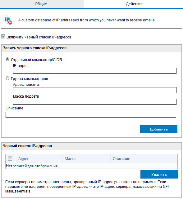 - На вкладке Общие установите флажок Включить черный список IP-адресов для блокировки всех писем, получаемых с определенных IP-адресов.